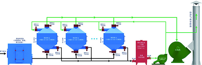 有機廢氣吸附凈化流程:廢氣首先經(jīng)過干式過濾器去塵雜,而后均勻地通過活性炭吸附床,廢氣中的污染物被吸附在活性炭的面積,經(jīng)凈化后的氣體通過煙囪達標排放。活性炭脫附再生及催化燃燒流程:當吸附達到飽和后,通過閥門切換進行再生。熱空氣送入吸附床,對活性炭進行加熱。活性炭受熱解析出較高濃度的有機氣體,由脫附循環(huán)風機引入催化燃燒床,廢氣經(jīng)催化燃燒生成二氧化碳.水等無害氣體和部分的熱量。熱量回用于吸附床內(nèi)活性炭的解析再生。整套吸附和催化燃燒過程由PLC系統(tǒng)實現(xiàn)自動控制。