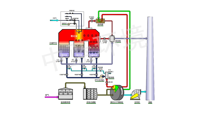 3. RTO氧化階段:沸石轉(zhuǎn)輪實際上是個濃縮裝置,把低濃度大風(fēng)量有機廢氣里的分子捕捉、富集到沸石分子篩上面。當(dāng)脫附時就能用很小的